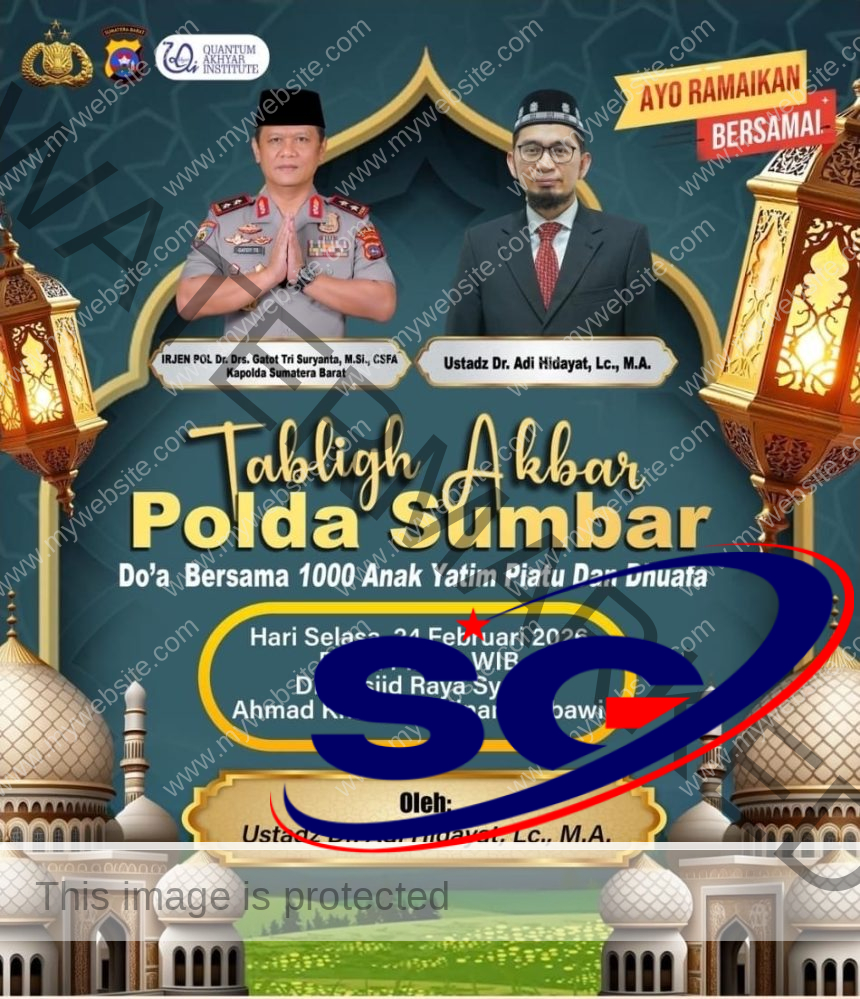Padang, Sinyalgonews.com,–Polda Sumatera Barat kembali menghadirkan kegiatan keagamaan penuh makna melalui Tabligh Akbar dan doa bersama 1000 anak yatim, piatu, serta dhuafa yang akan dilaksanakan pada Selasa, 24 Februari 2026, pukul 12.00 WIB di Masjid Raya Syekh Ahmad Khatib Al Minangkabawi, Kota Padang.