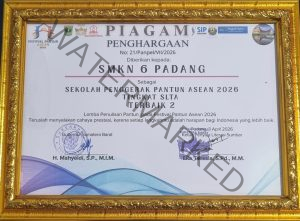Pada malam penganugerahan yang berlangsung di Istana Gubernur Sumatera Barat, SMKN 6 Padang berhasil meraih prestasi gemilang, yakni Juara 2 Sekolah Penggerak Pantun ASEAN 2026 tingkat SLTA